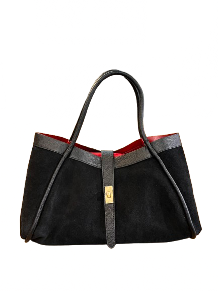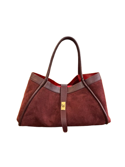 Borsa a spalla scamosciata, pochette interna con zip, chiusura con gancio. Vera pelle.