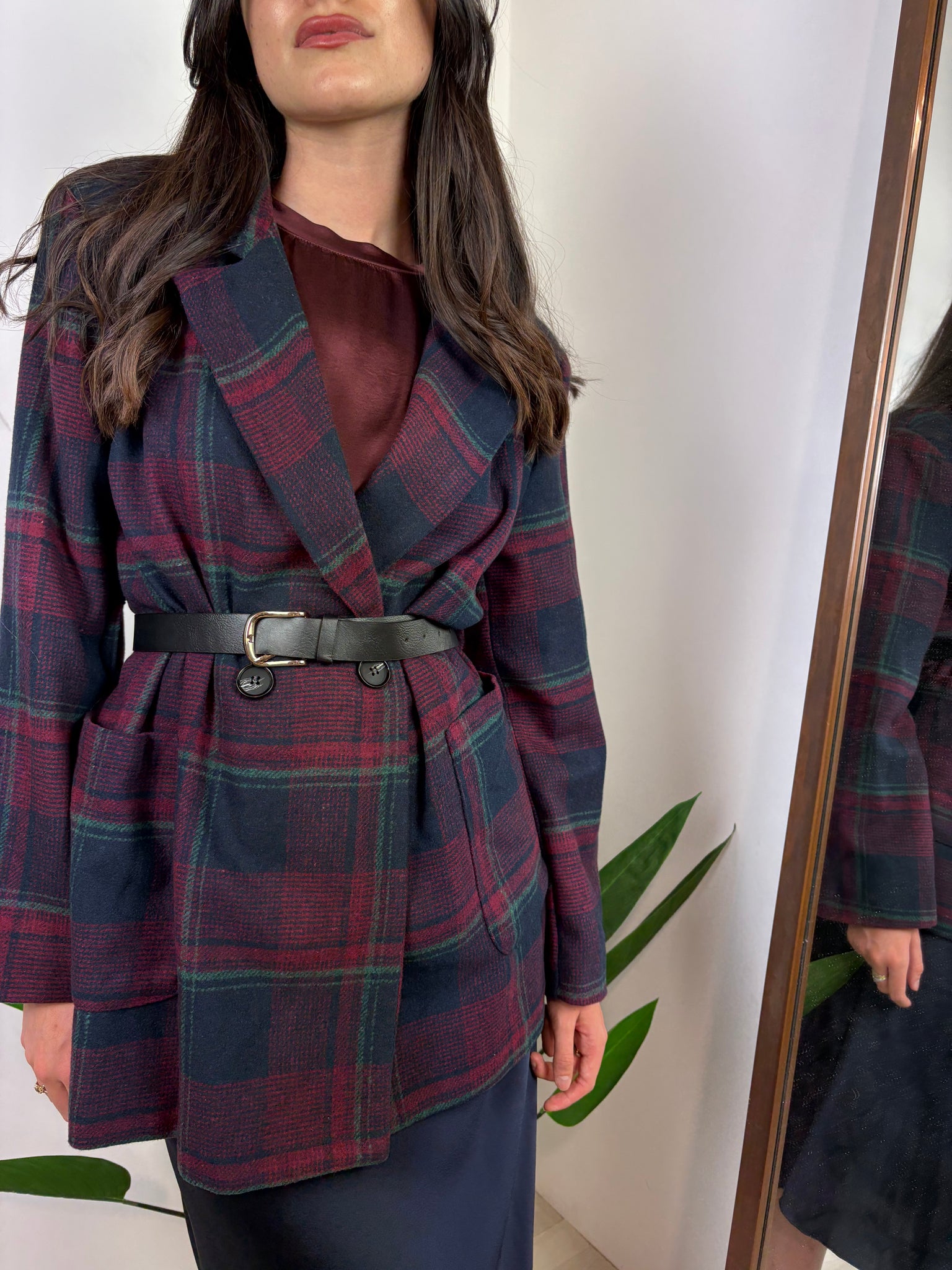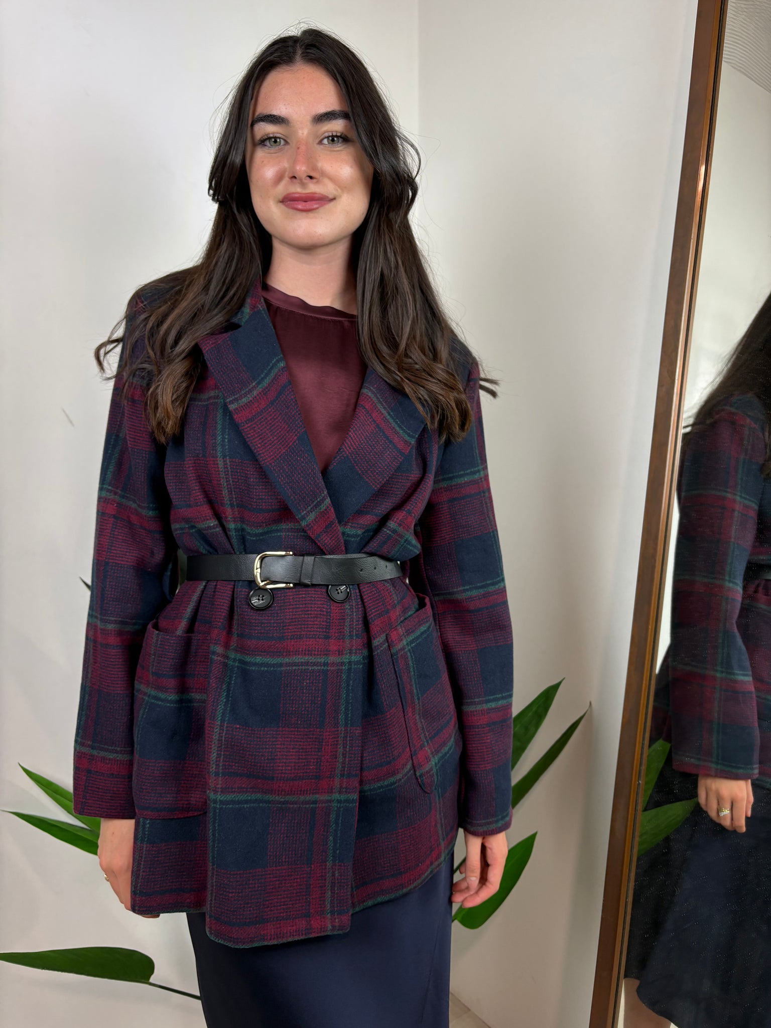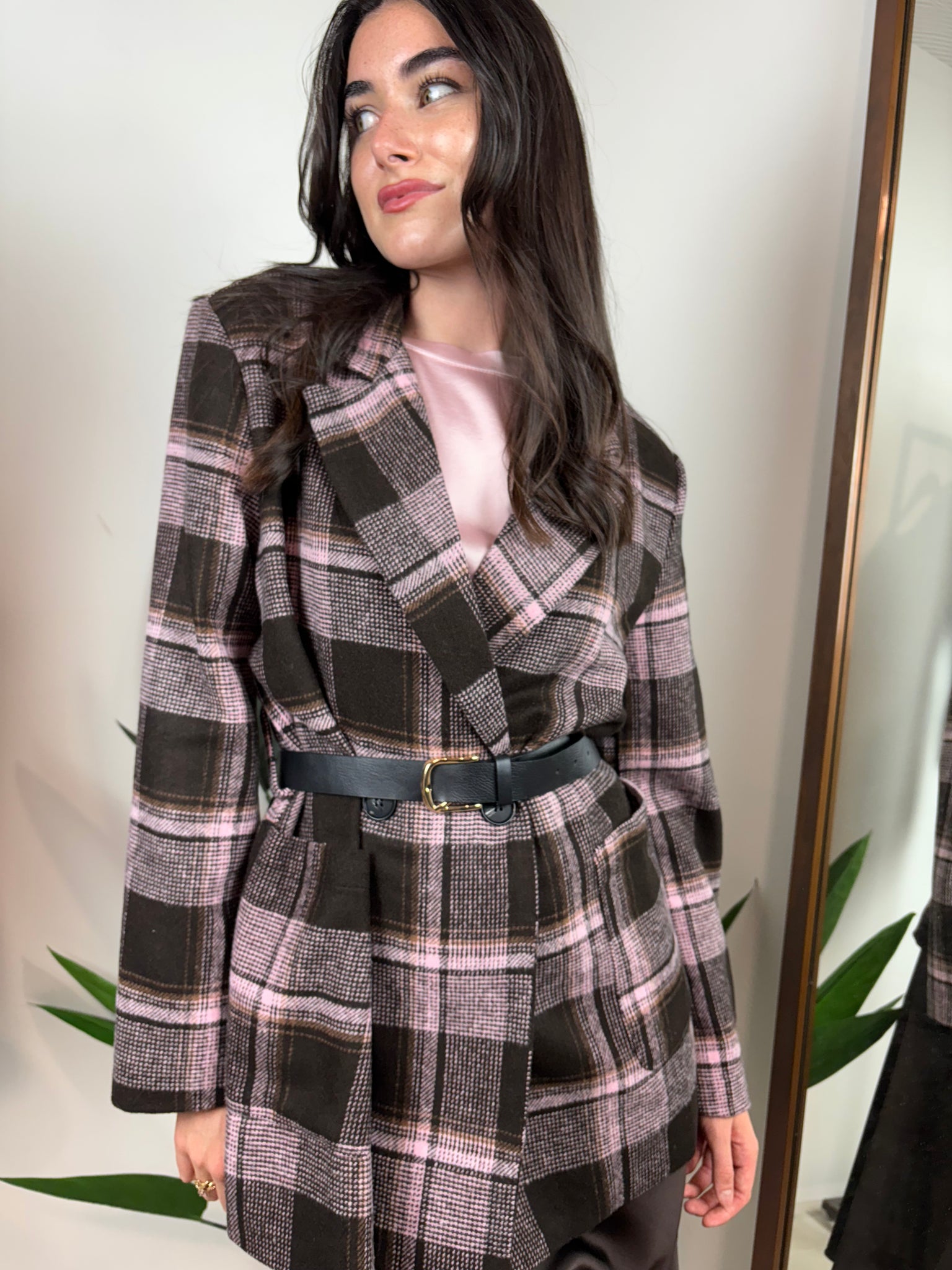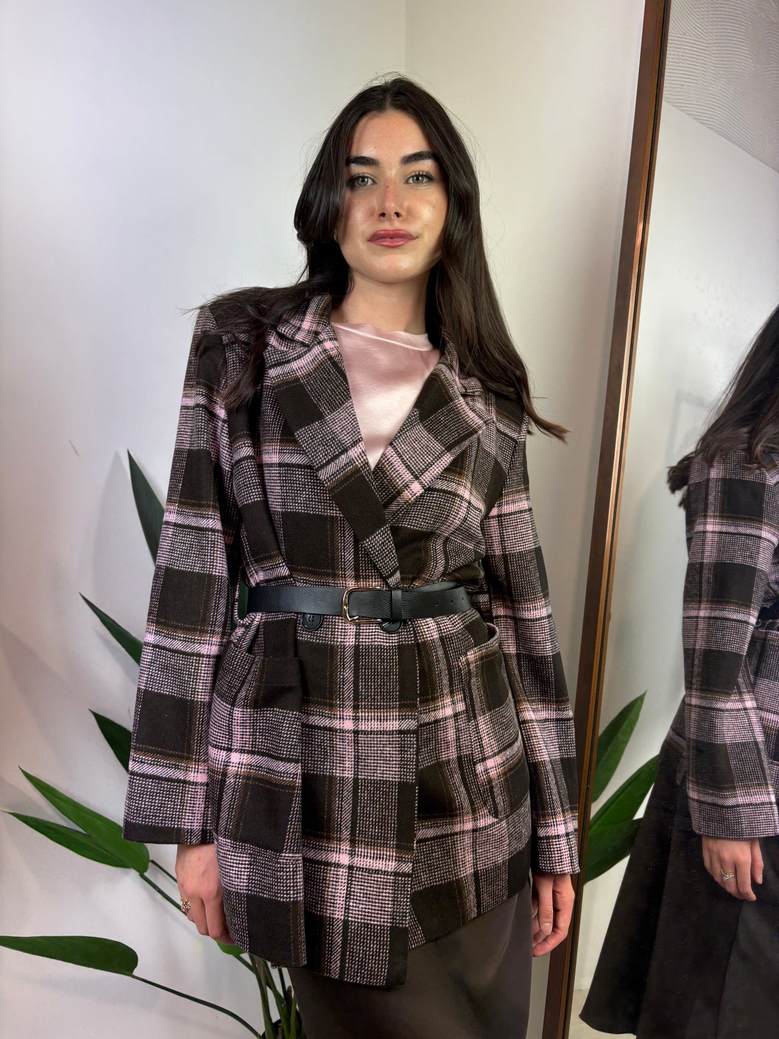 Giacca doppiopetto a fantasia, tasche frontali, con spalline. Chiusura frontale con bottoni e cintura (inclusa). Composizione 30% acrilica 25% poliestere 15% cotone 30% altri fibre Fodera 100% poliestere