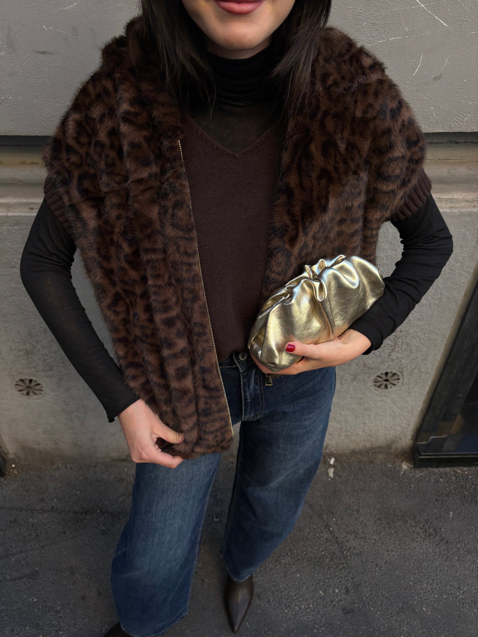 Gilet in ecopelliccia, fantasia animalier, con cappuccio. Tasche a filetto, chiusura con cerniera frontale. Composizione 100% poliestere FODERA 100% poliestere