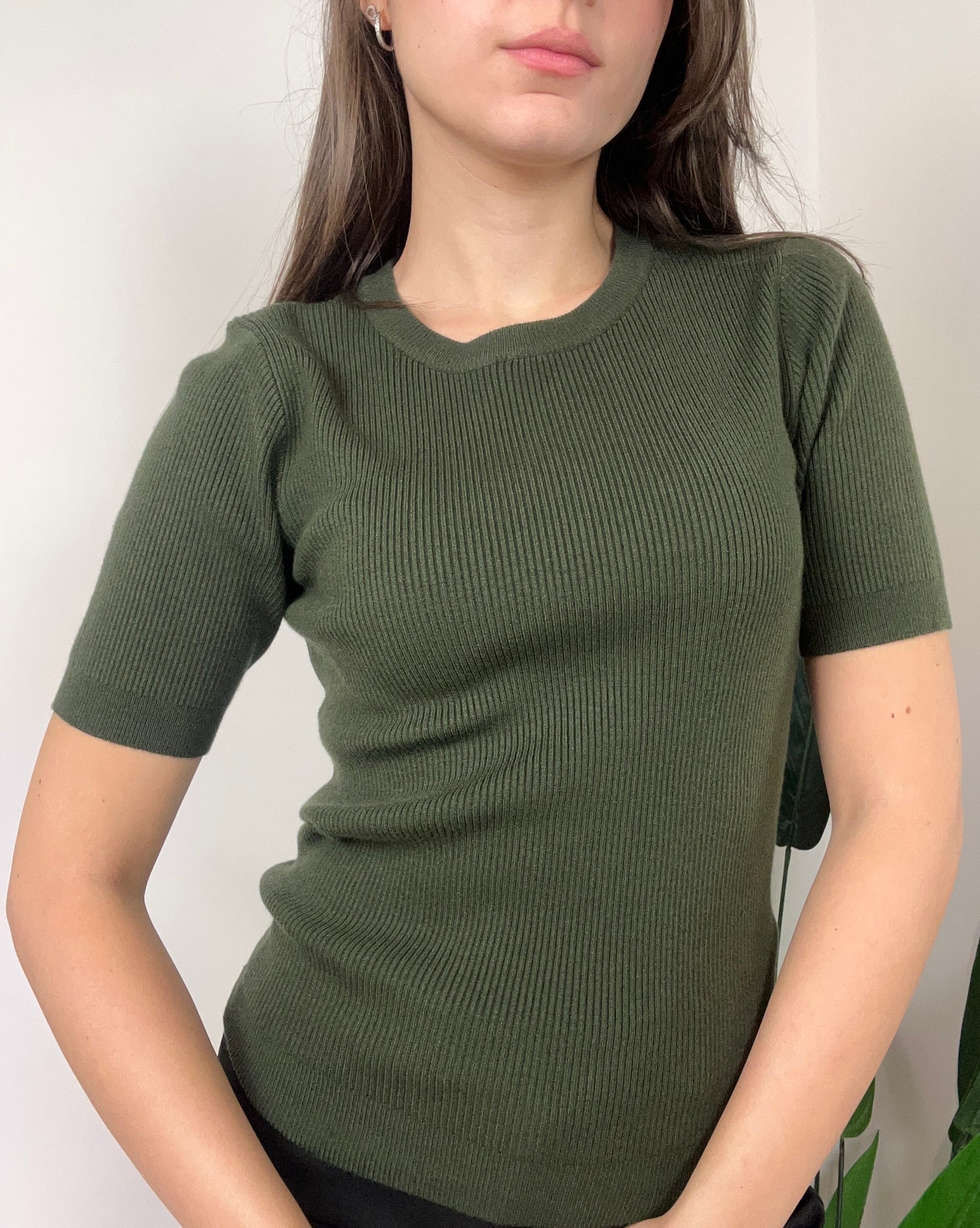Maglia a costine, scollo tondo, maniche corte. Composizione 49% viscosa 28% poliammide 23% nylon