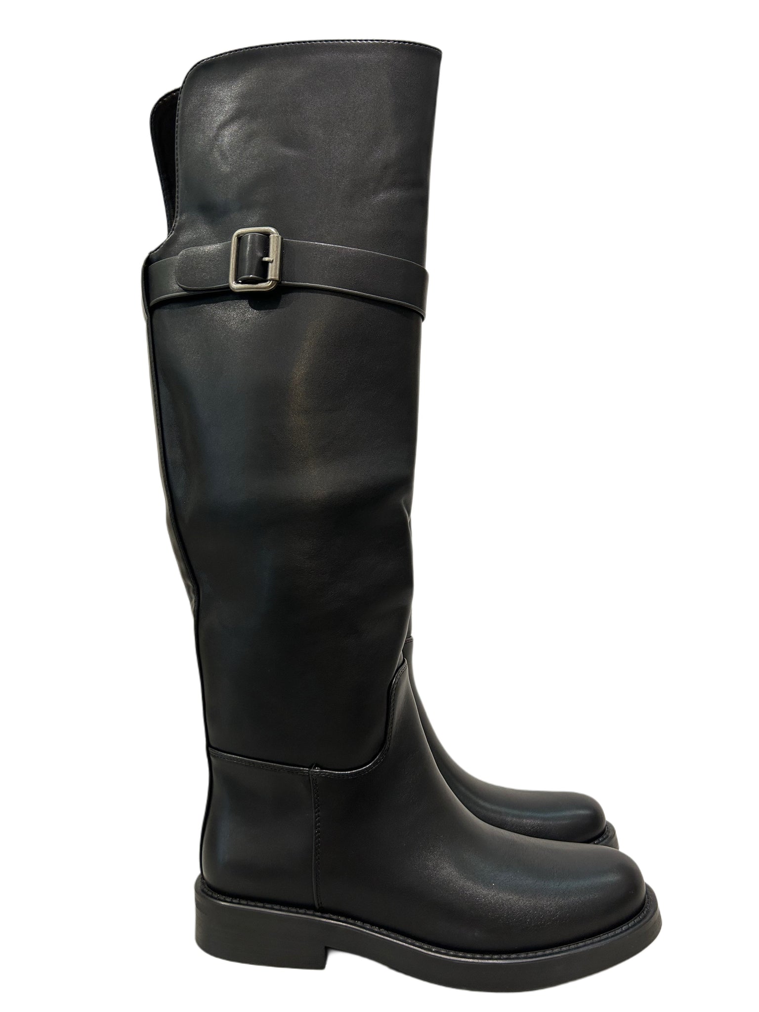 Stivale alto in similpelle, punta arrotondata, dettaglio di fibbia.