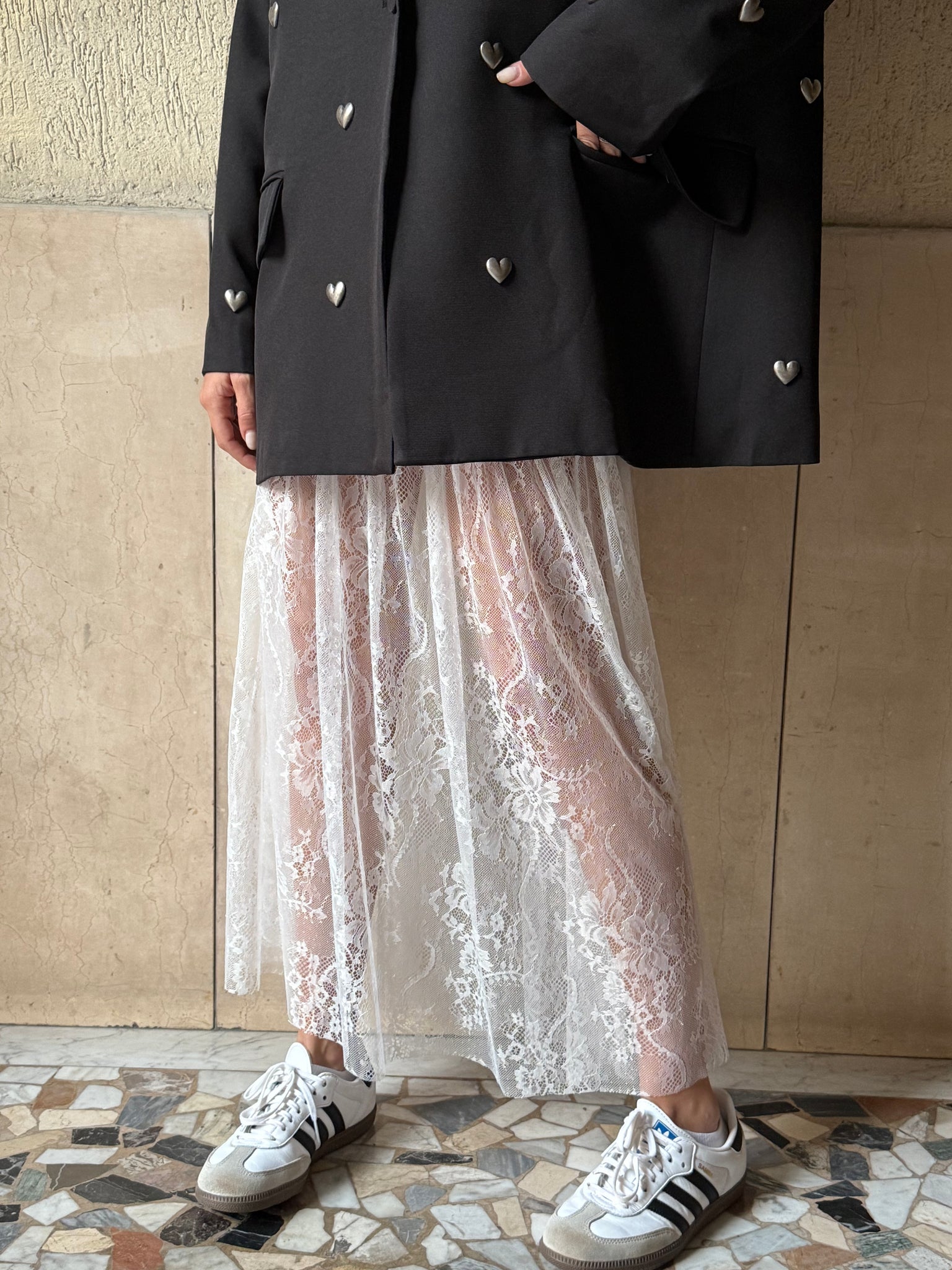 Gonna lunga trasparente di pizzo, con elastico in vita.