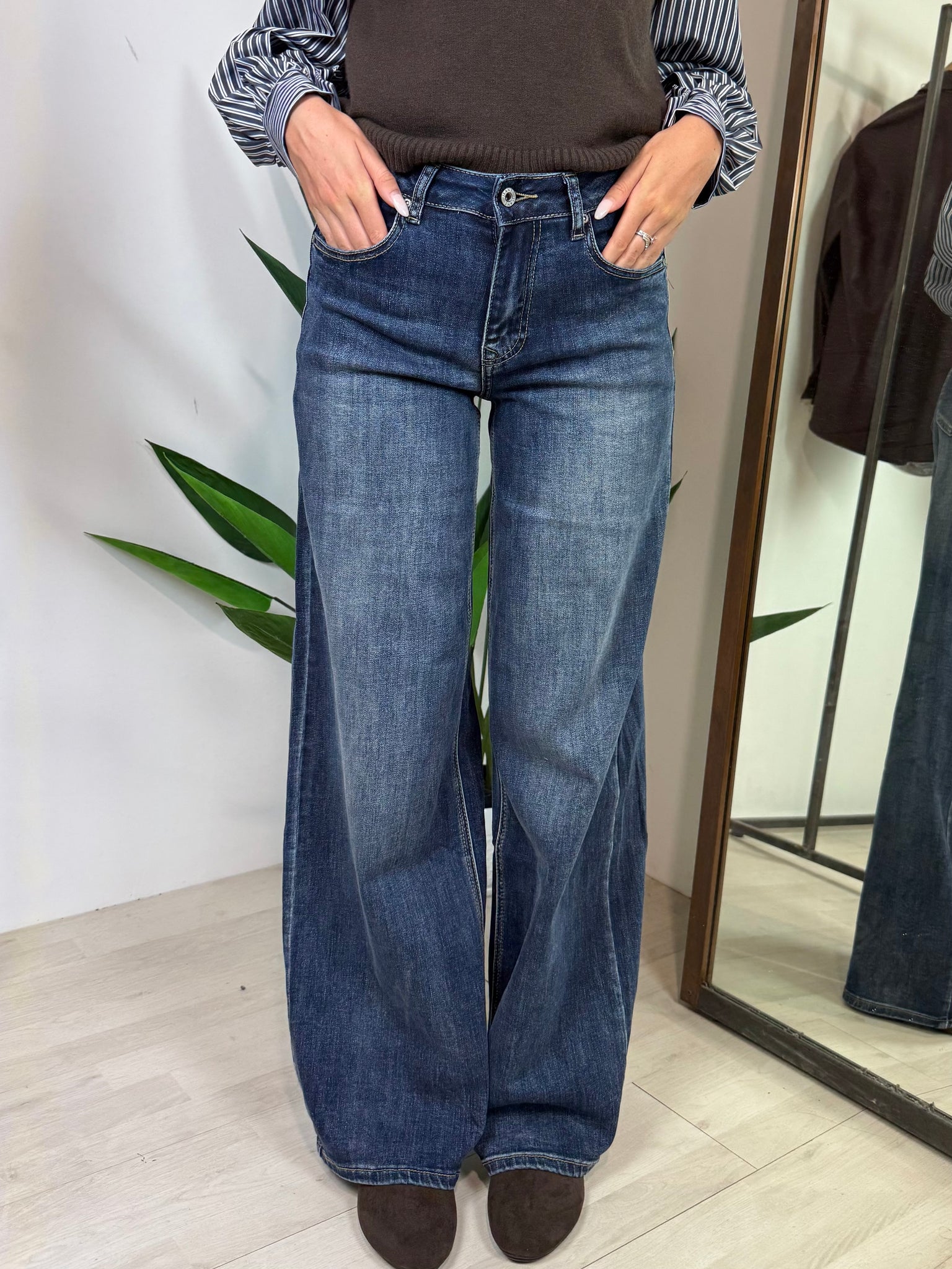 Jeans a vita alta, modello palazzo, gamba dritta, cinque tasche. Chiusura con cerniera e bottone.