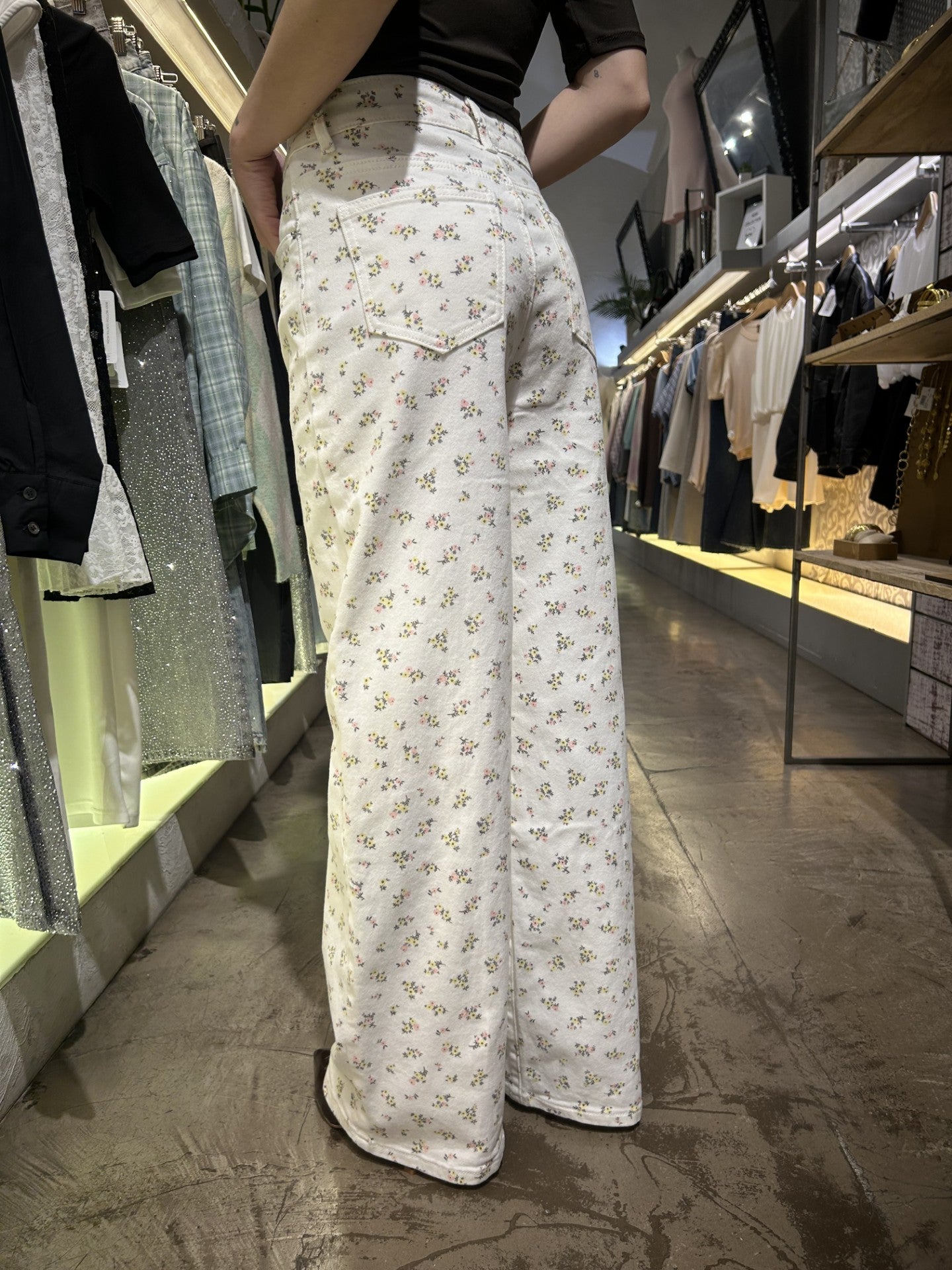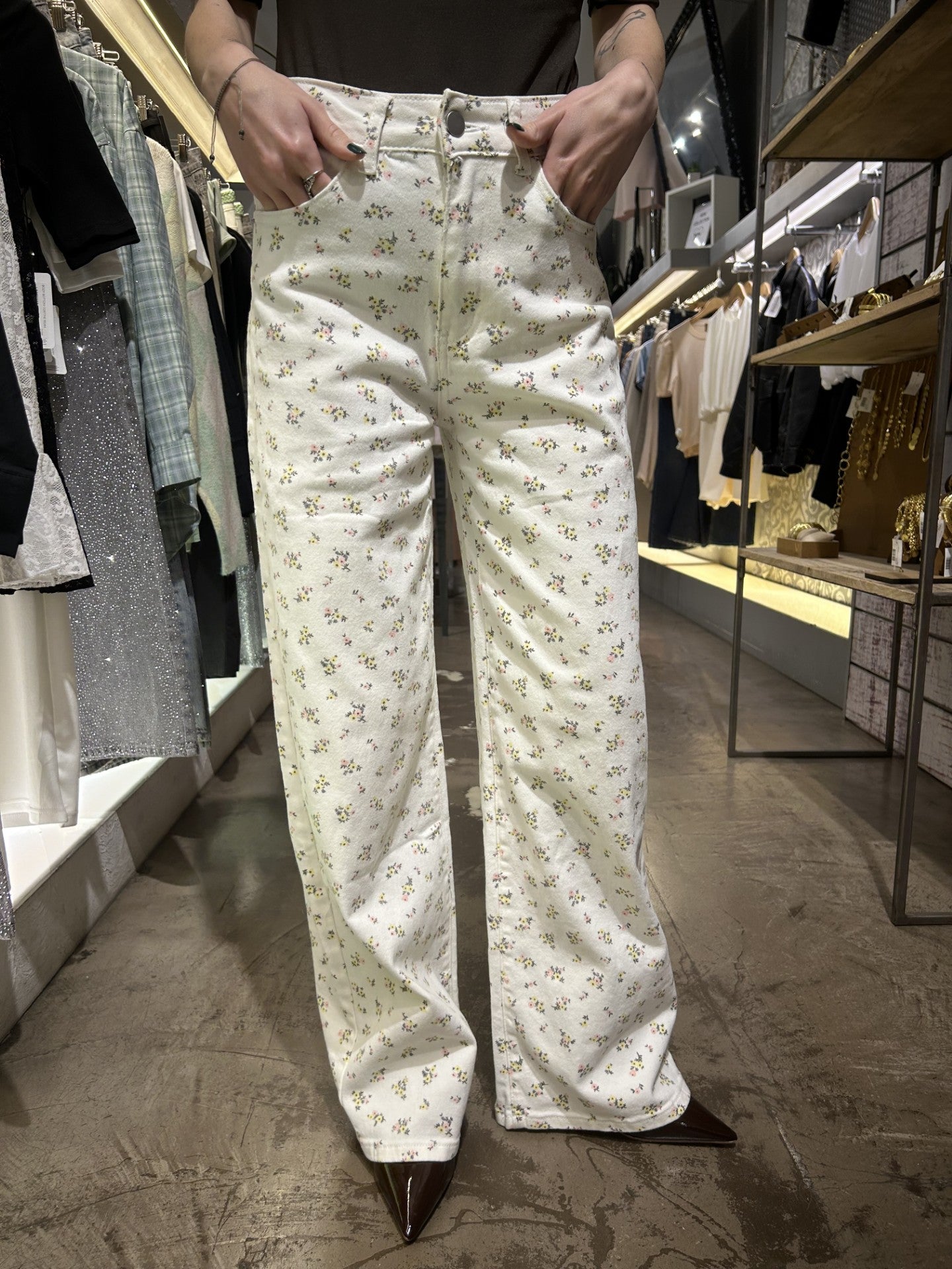 Jeans a fantasia, gamba dritta, vita media, cinque tasche. Chiusura con cerniera e bottone.