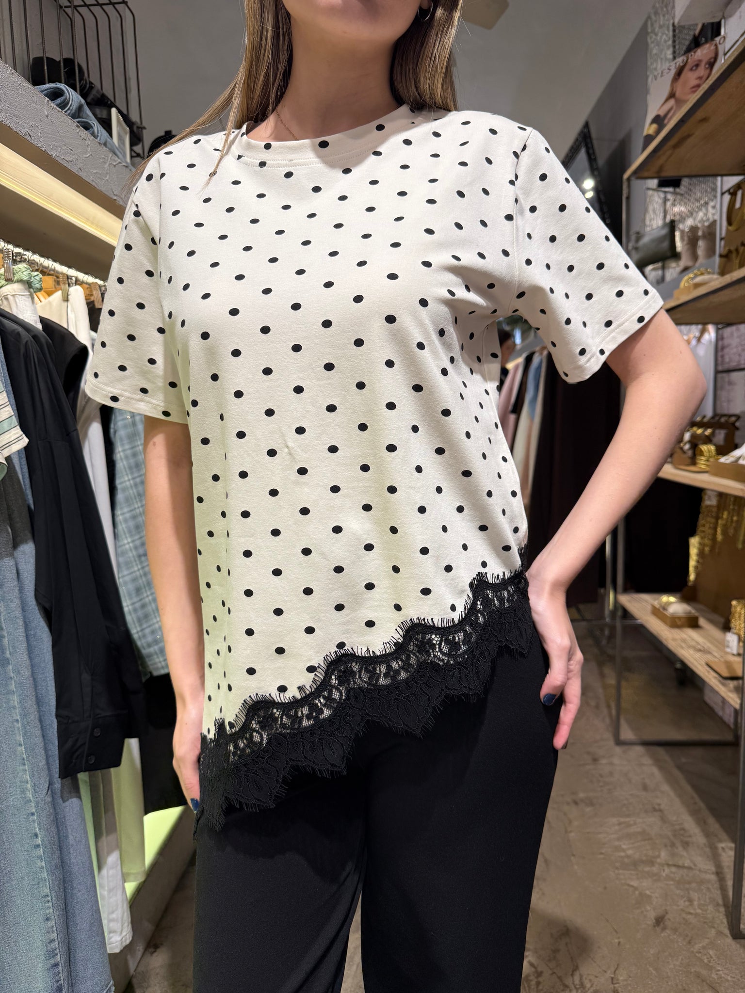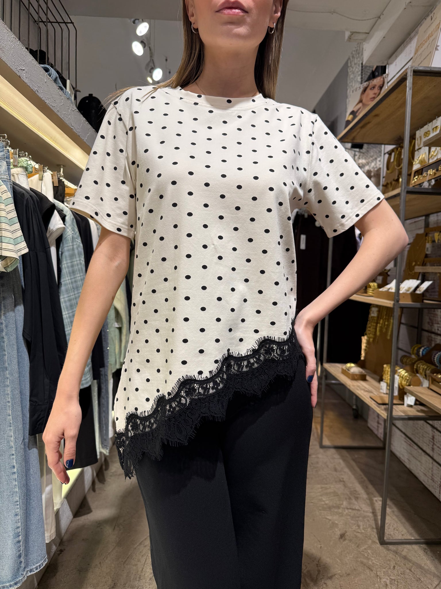 Maglia fantasia pois con dettaglio trasversale in pizzo 95% cotone 5% elastane