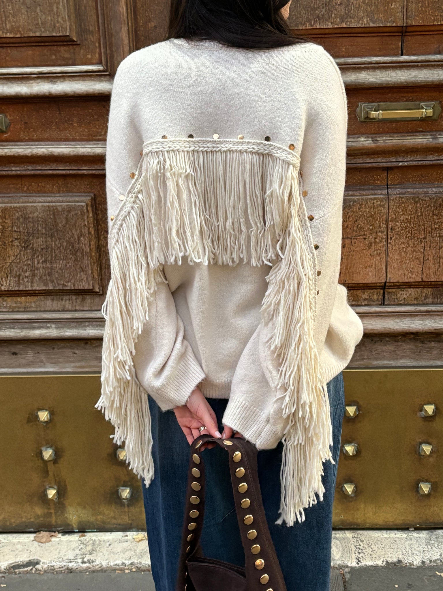 Borsa di pelle scamosciata, dettaglio di frange, a spalla. Chiusura con cerniera.